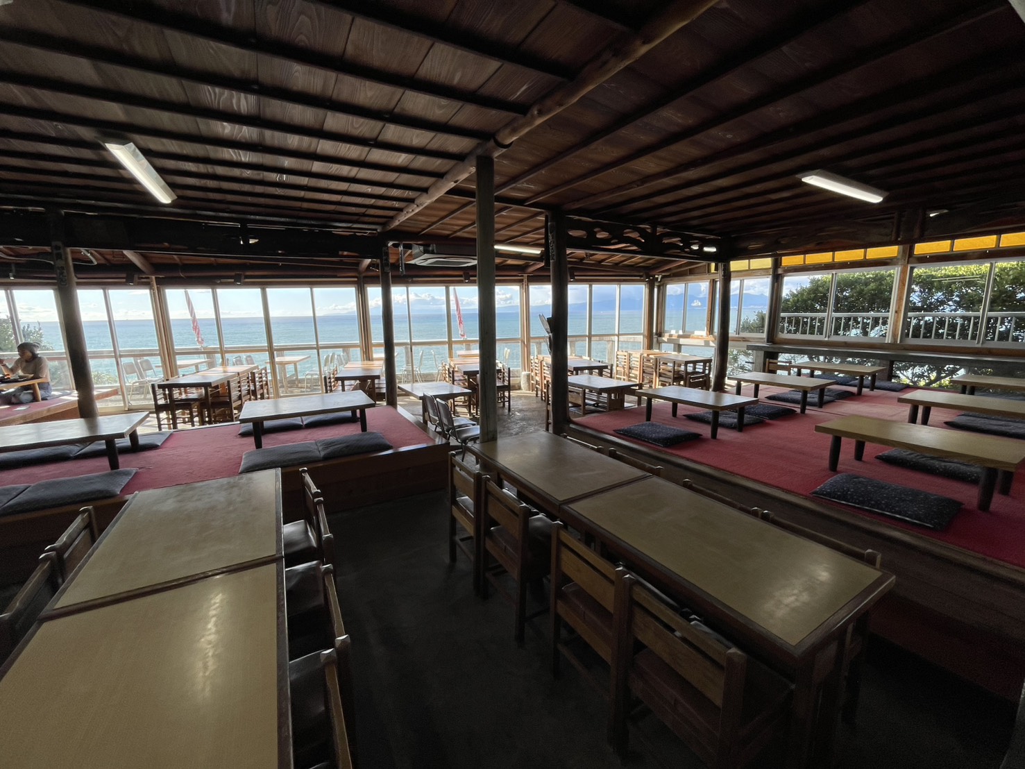 壁一面が窓になっていて、点愛のどの席からでも綺麗な海を見ながらお食事を楽しむことができます。
